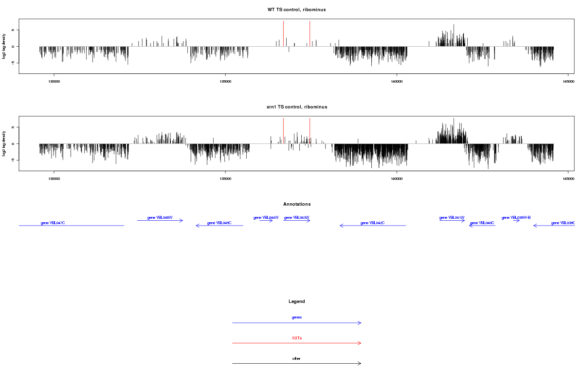 Sequence read density, YBL043W, ECM13, (2:129578..144577)