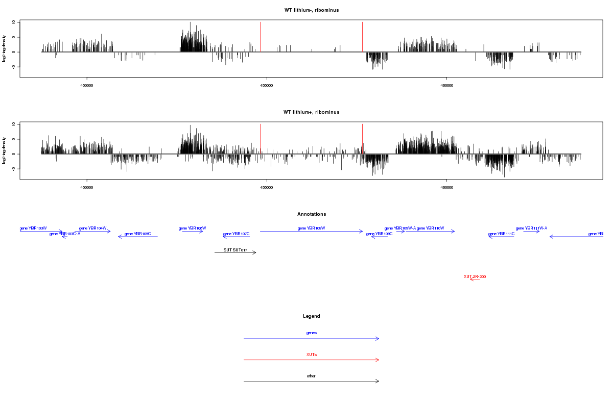 Sequence read density, YBR108W, AIM3, (2:448738..463737)
