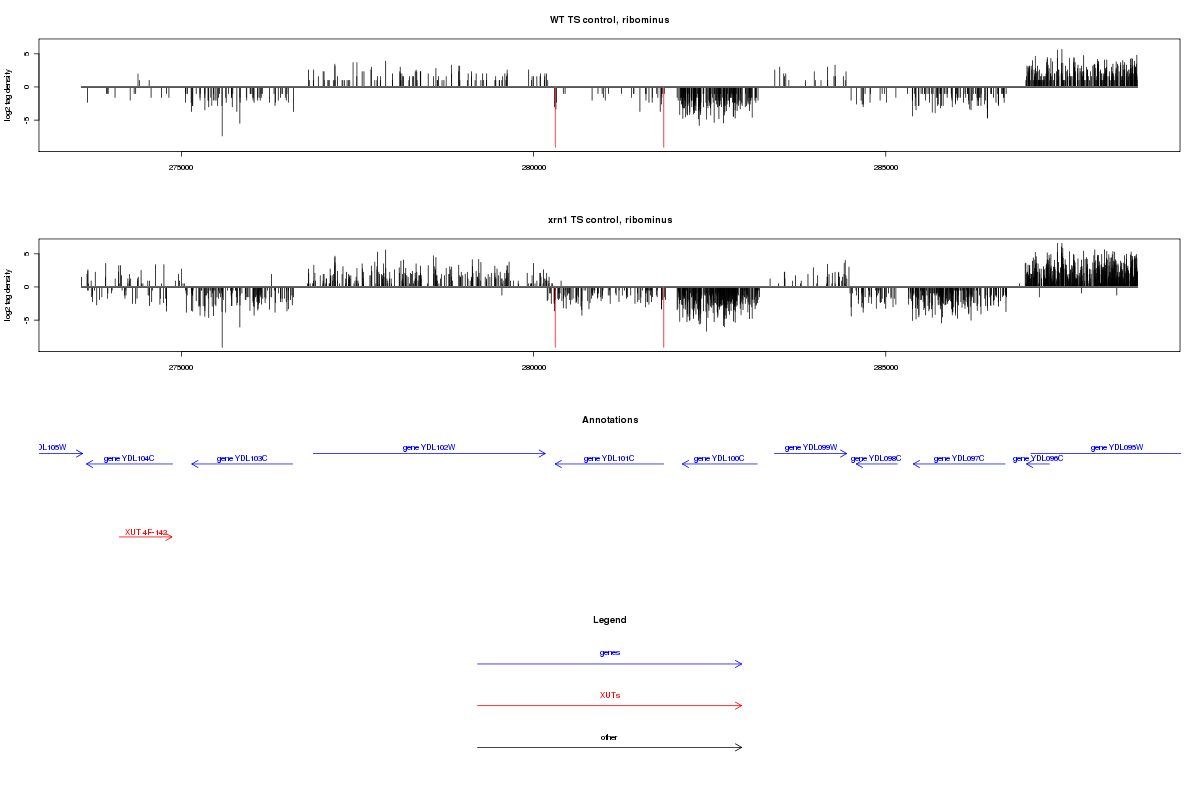 Sequence read density, YDL101C, DUN1, (4:273578..288577)