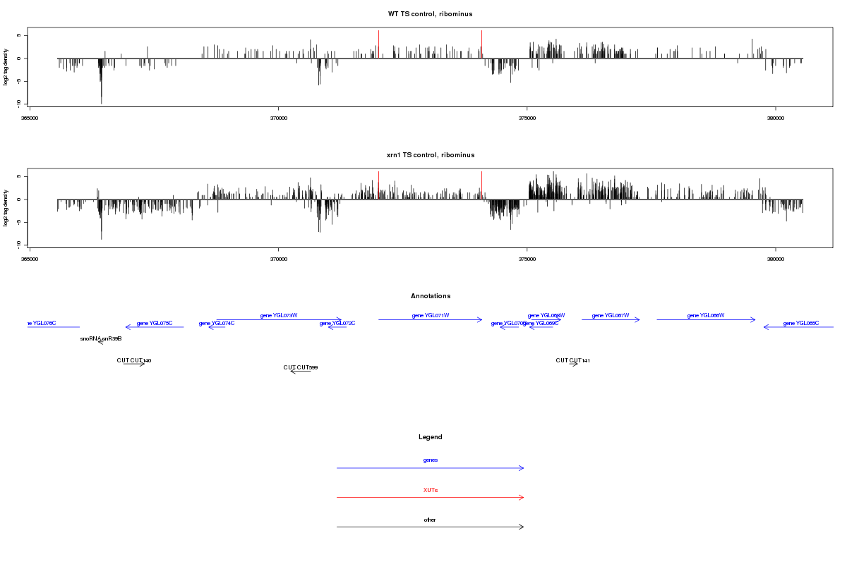 Sequence read density, YGL071W, AFT1, (7:365551..380550)