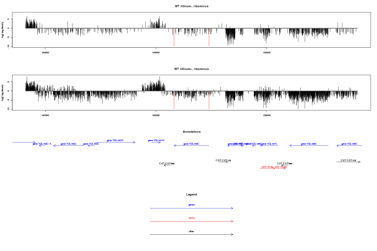 Sequence read density, YGL190C, CDC55, (7:139105..154104)