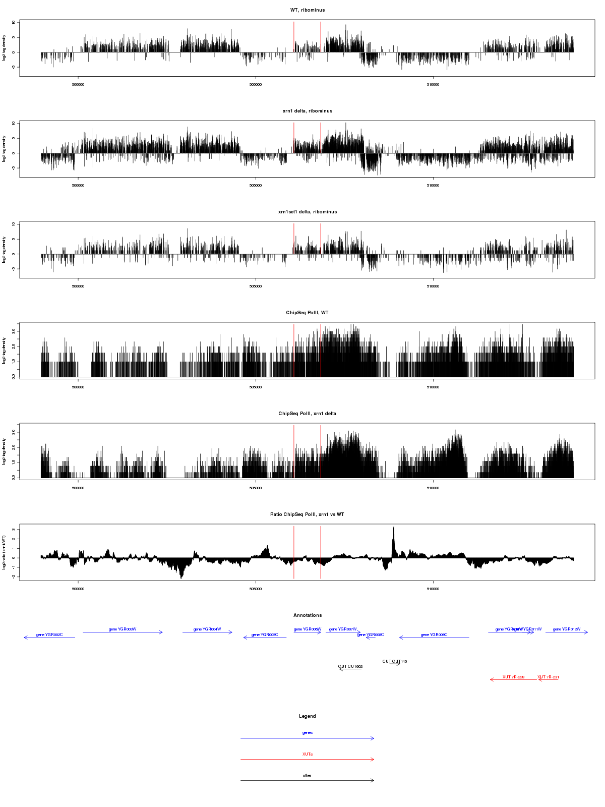 Sequence read density, YGR006W, PRP18, (7:498952..513951)