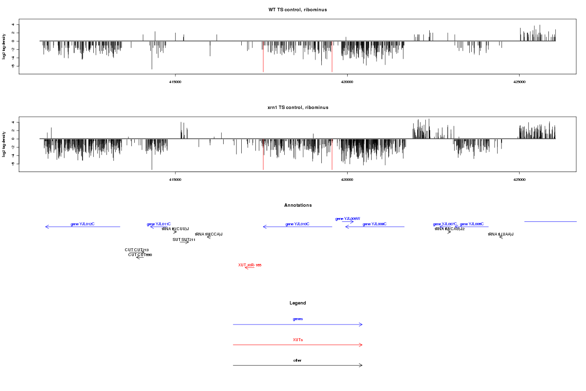 Sequence read density, YJL010C, NOP9, (10:411055..426054)
