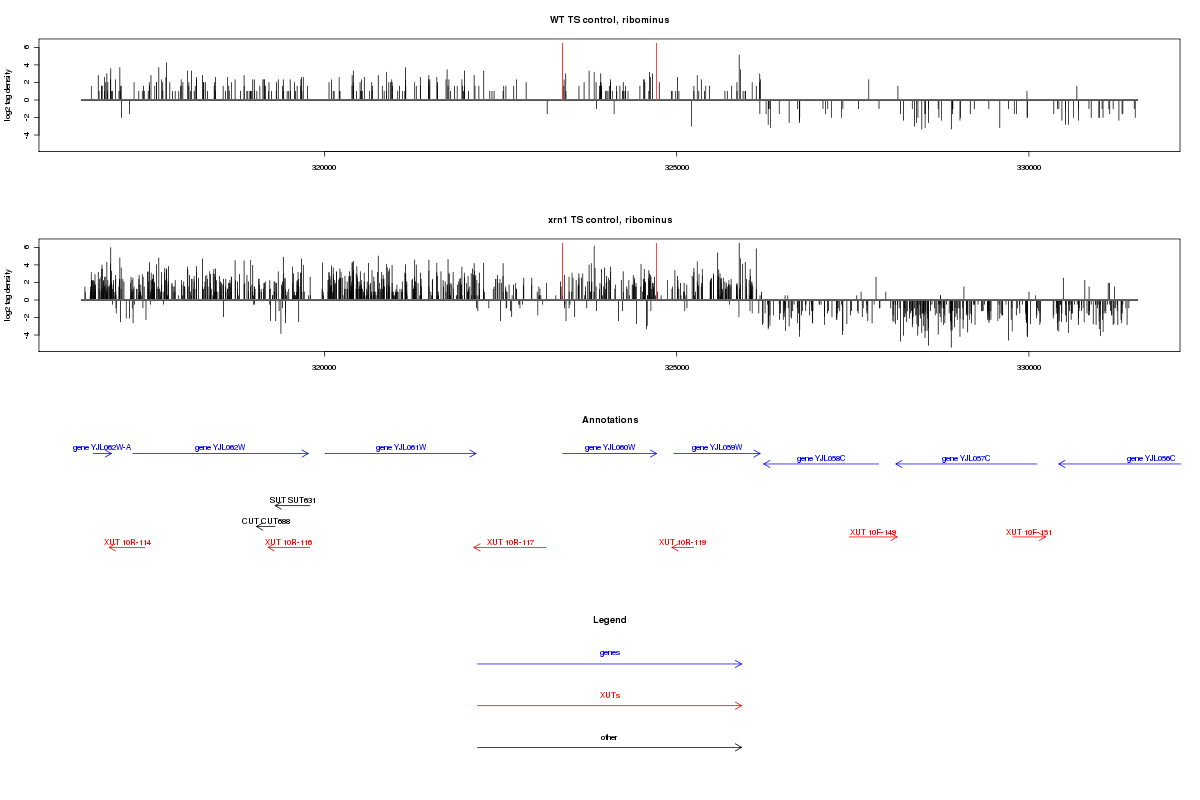 Sequence read density, YJL060W, BNA3, (10:316547..331546)