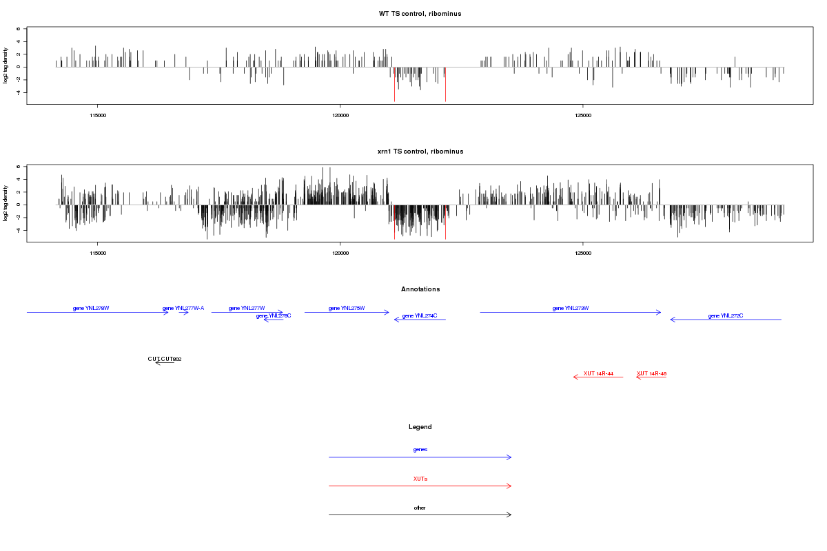Sequence read density, YNL274C, GOR1, (14:114144..129143)