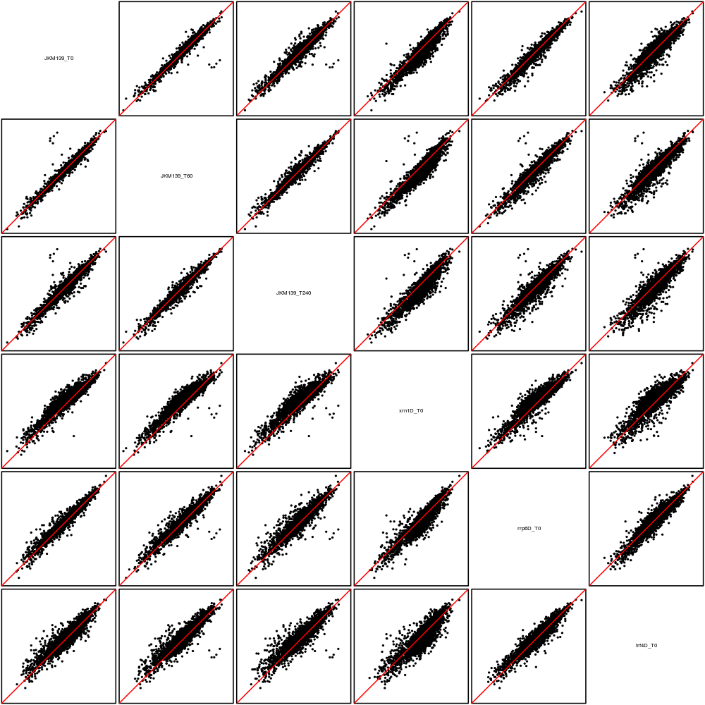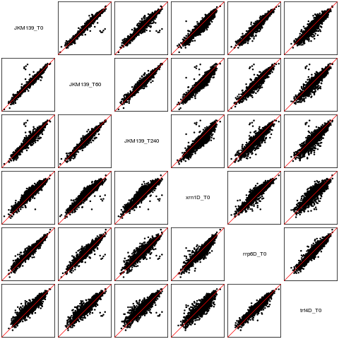 Scatter plots main for Total RNAseq analysis upon DSB induction in WT, xrn1, rrp6 and trf4 yeast strains.