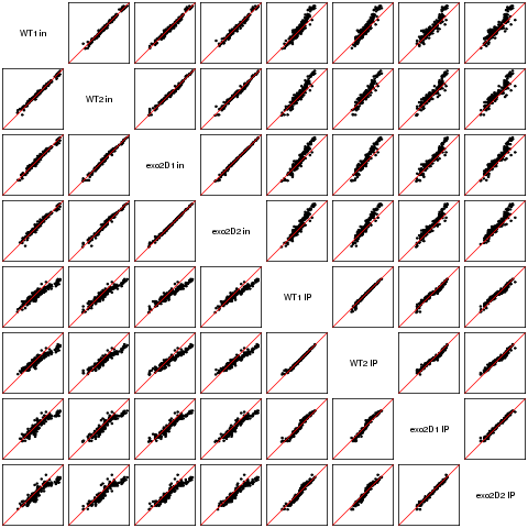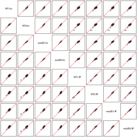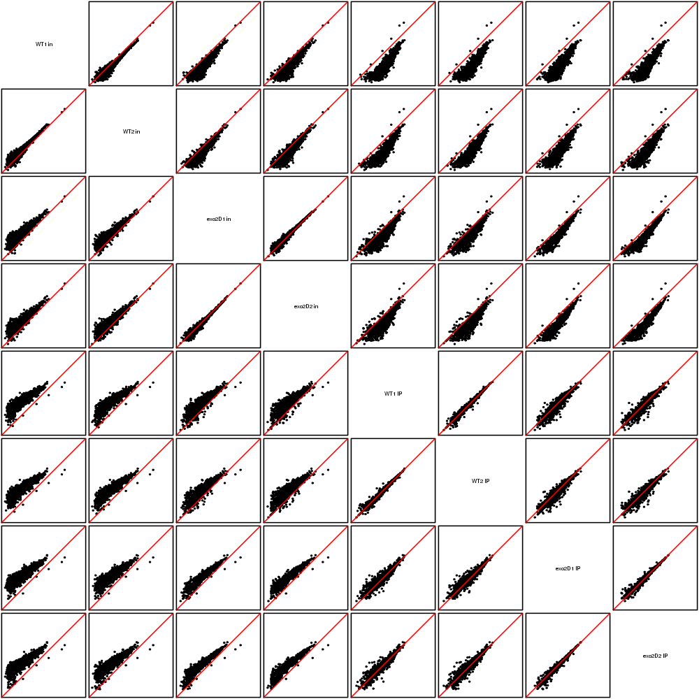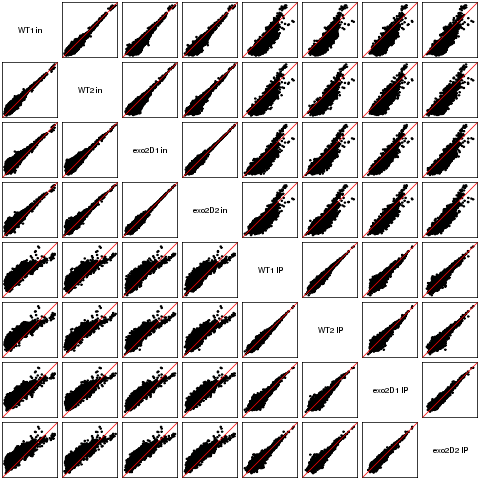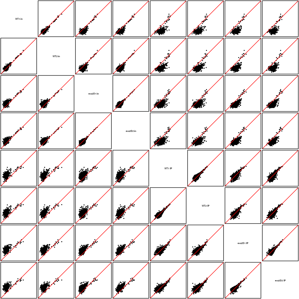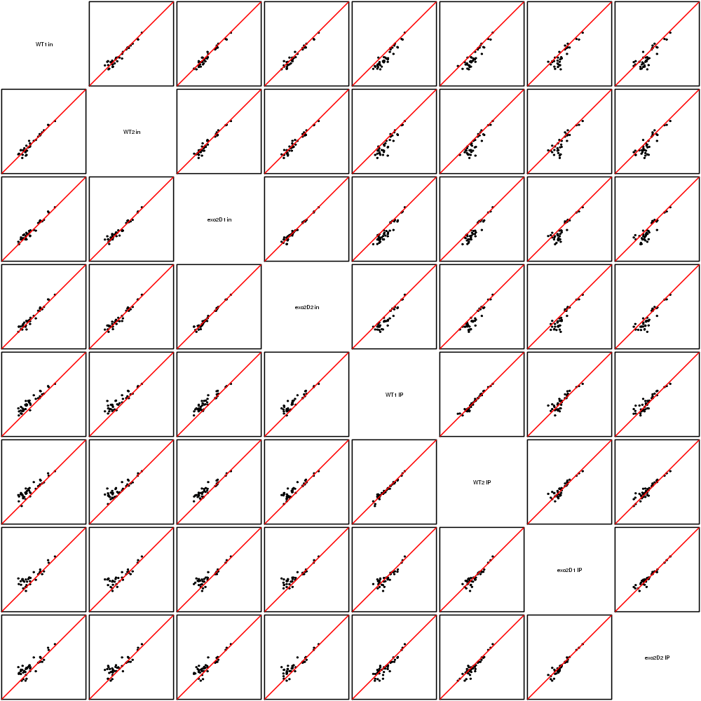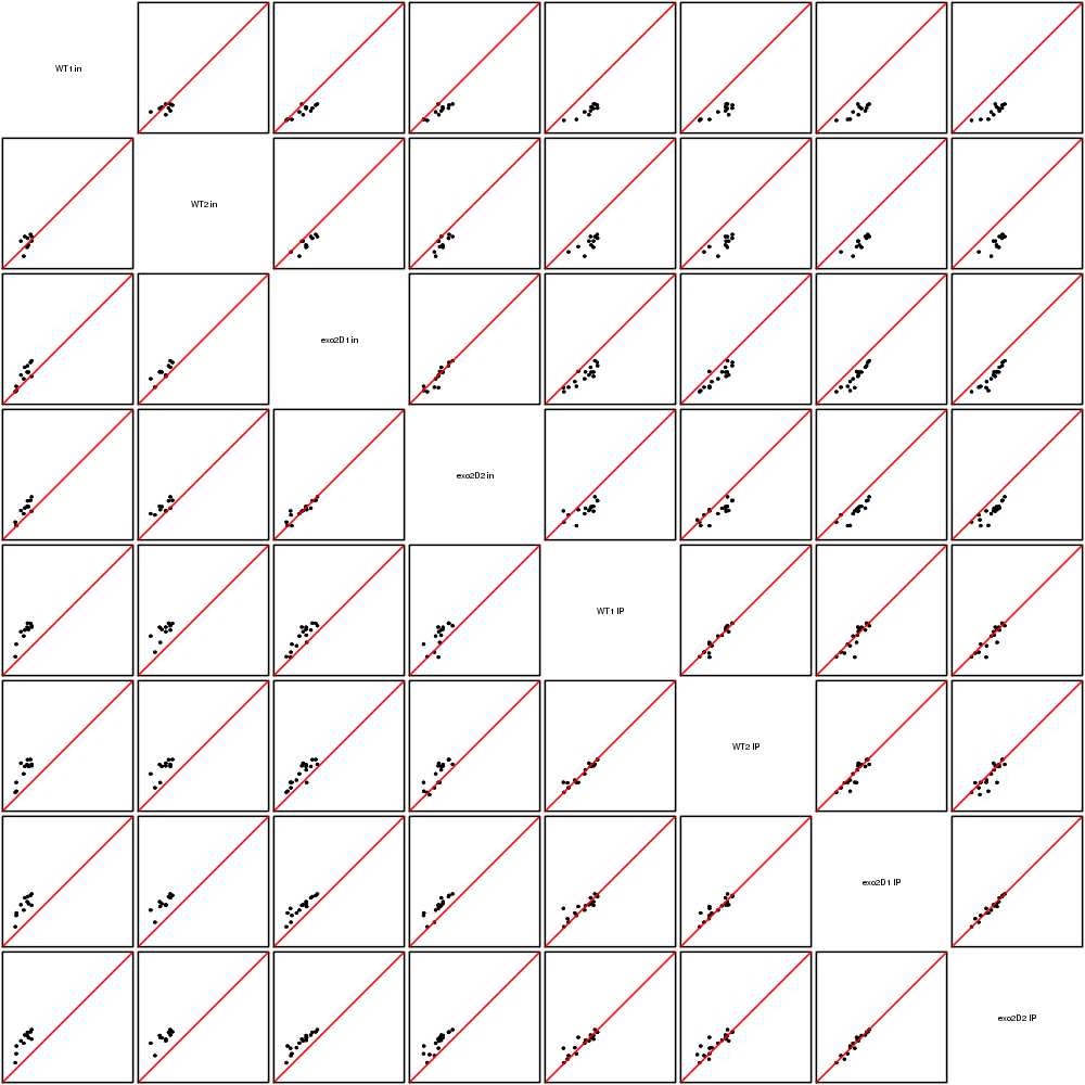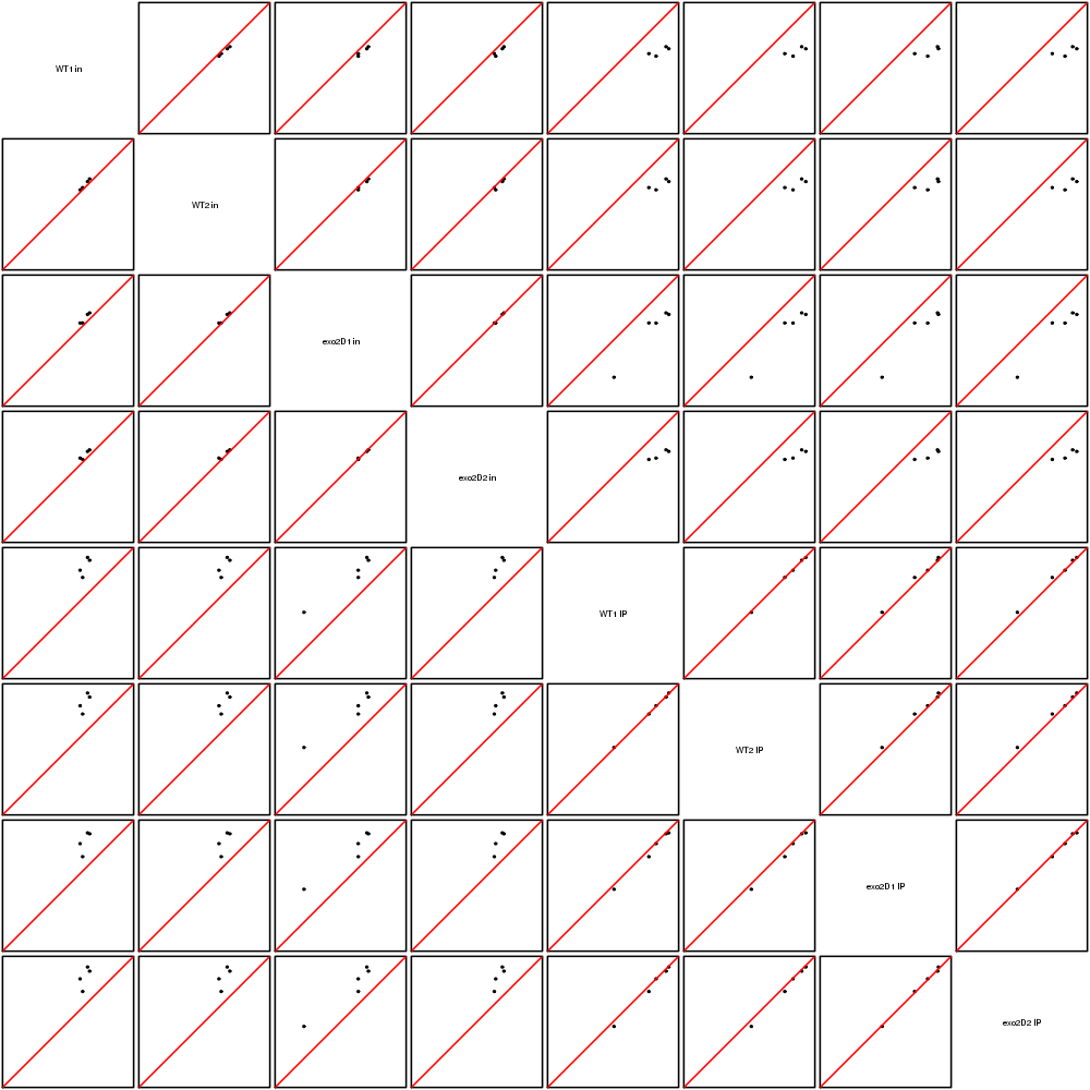 Scatter plots replicates for NETseq in exo2delta condition in S. pombe