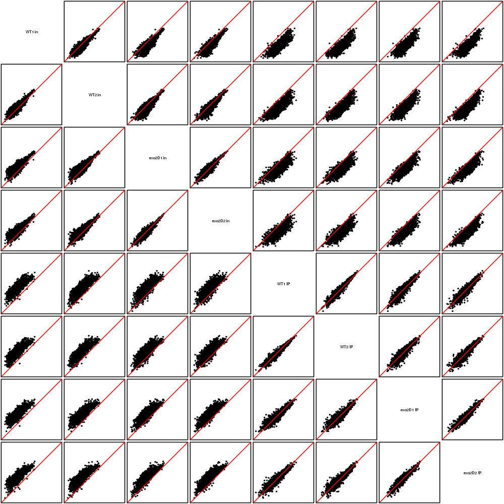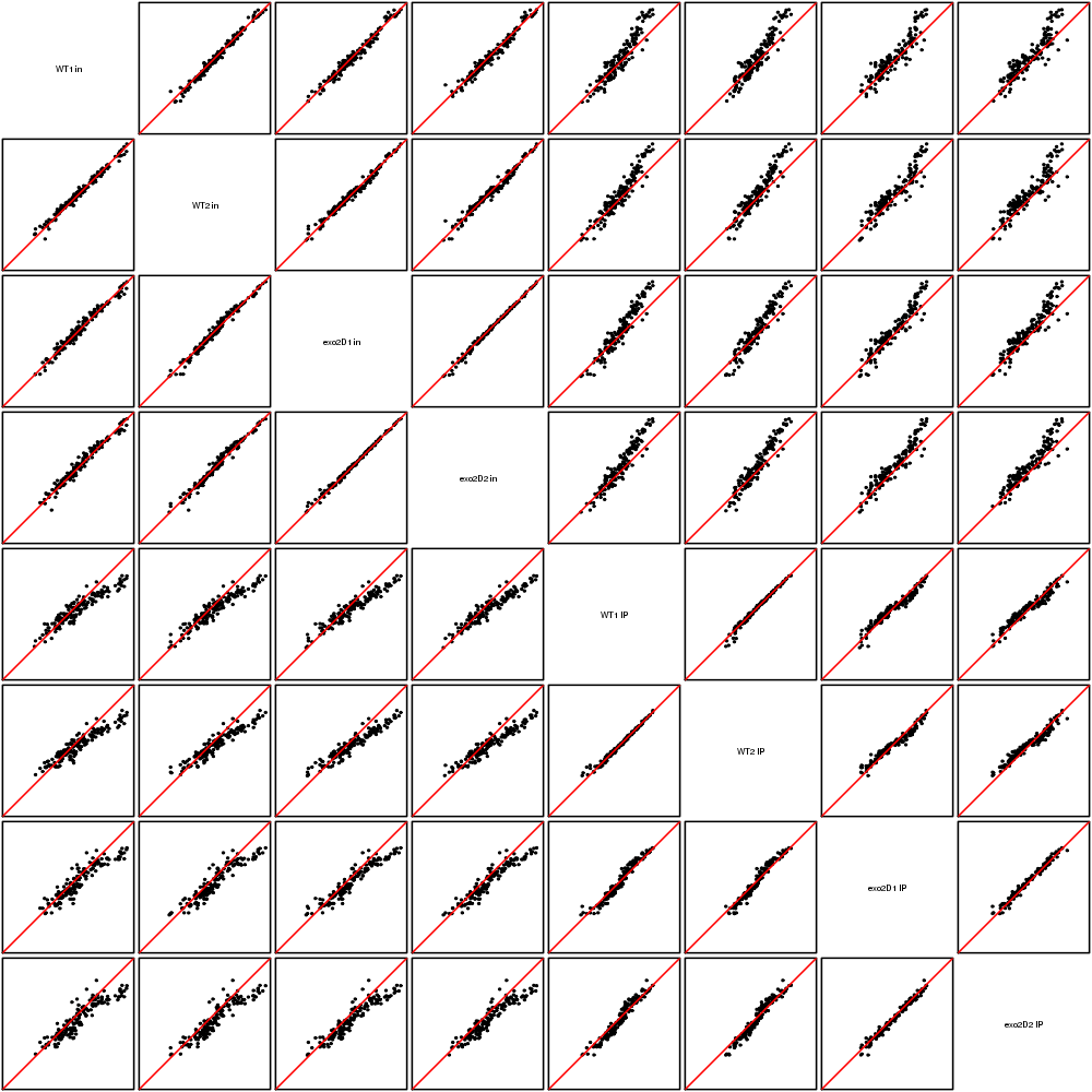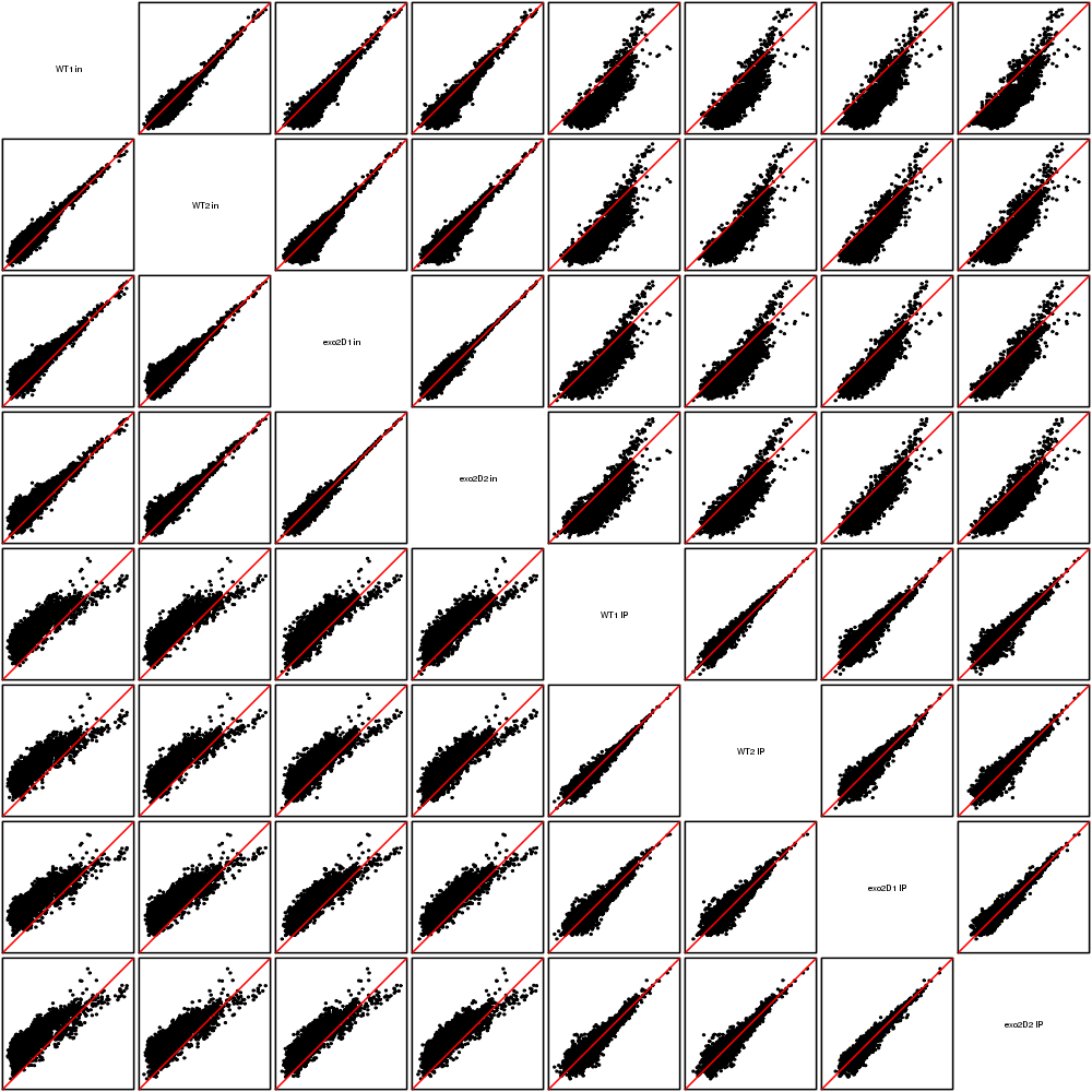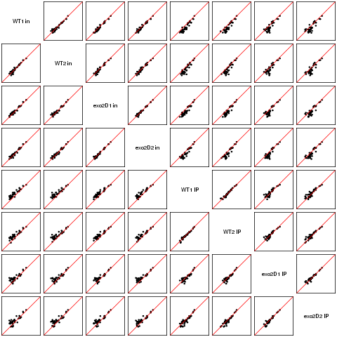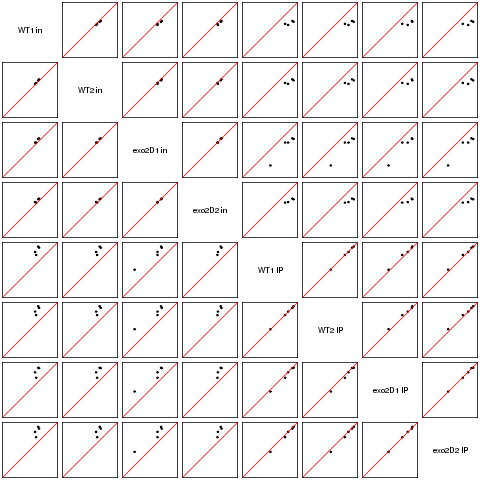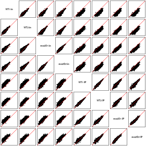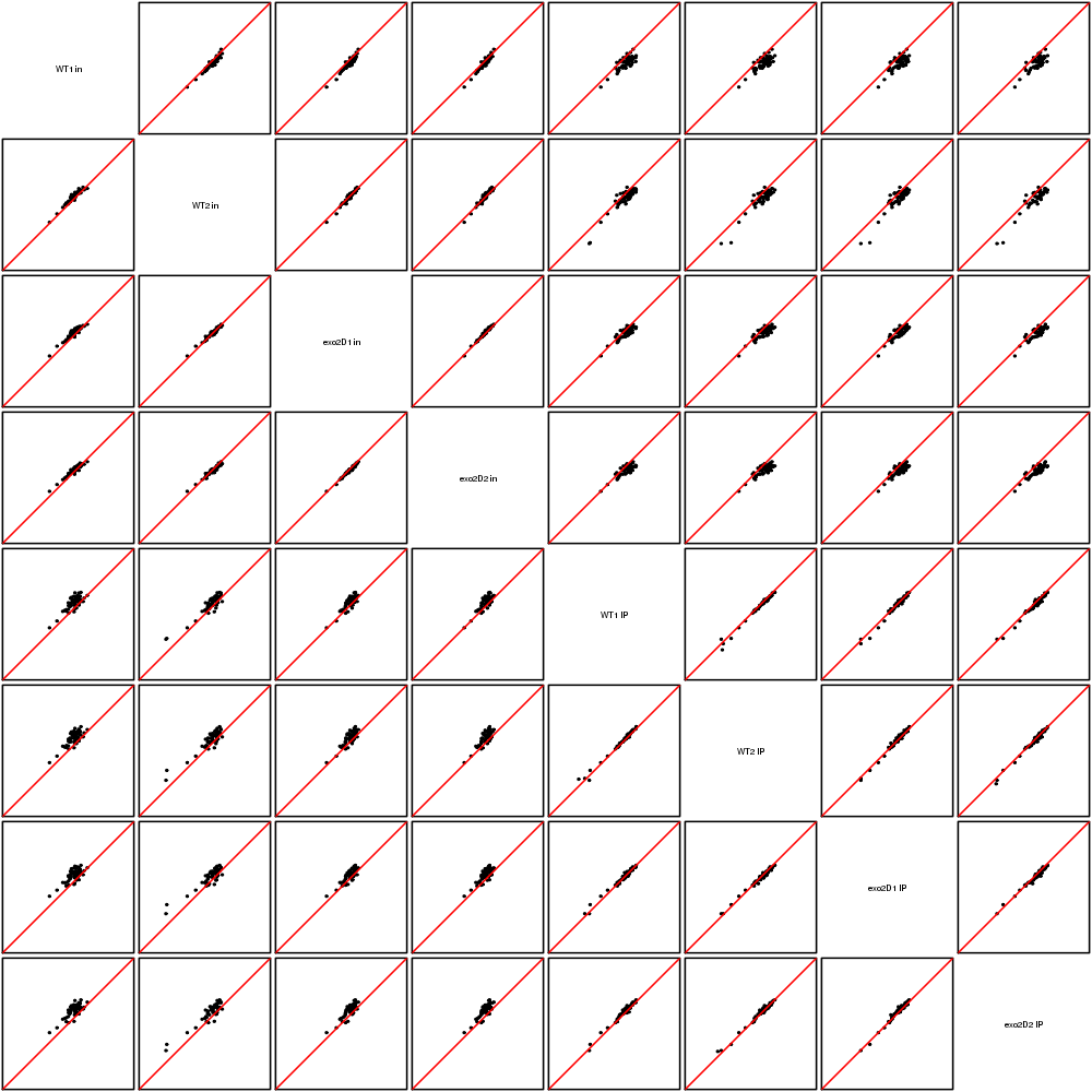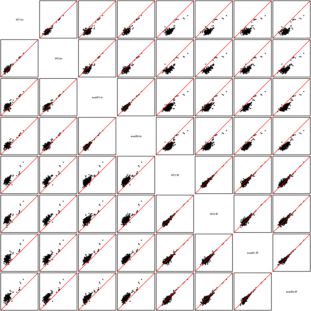Scatter plots replicates for NETseq in exo2delta condition in S. pombe